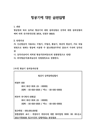 주요내용 채무자가 항공기를 소유하고 있을 때 채권자가 법적 절차(강제경매, 임의경매 등)를 통해 해당 항공기를 압류하고 경매에 부쳐 그 매각 대금으로 채무를 변제받는 민사집행 절차의 일종으로, 부동산이나 선박과 마찬가지로 특별한 재산에 대한 집행 대상이 됨. 본 내용은 그와 관련 된 개념, 집행대상, 관련 서식을 모두 기재해 둠으로서, 전문가적 시각에서 관련 절차를 진행할 수 있도록 정리하였다는 그 특징이 있다.