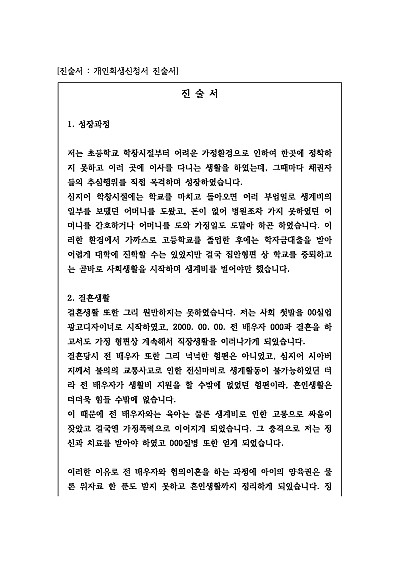 개인회생신청 시 어떠한 경위로 갱인회생을 신청하는지, 현재의 경제상황은 어떠한지 등은 개인회생 여부 등을 결정하는 매우 중요한 포인트입니다. 본 진술서는 개인회생신청 경위에 대한 내용을 담았고, 핵심은 협의이혼, 대출 생계를 위한 차업 및 폐업, 업종변경 폐업 등으로 정상적인 채무변제 불가 등의 사유로 결국 개인회생신청에 이르게 되었다는 내용입니다단 무단전재 방지목적으로 PDF 파일로 올리니혹 원본 파일이 필요하신 분들은 톡이나 문자메일전화 등을 주시면 작성방법 등에 대한 간단한 무료상담과 함께 원본 파일을 보내드리도록 하겠습니다.