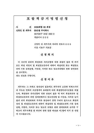 회생절차개시결정 전까지 강제집행, 가압류, 담보권실행을 위한 경매절차 등의 금지를 구할 목적으로 사용하는 양식임, 단 무단전재 방지목적으로 PDF 파일로 올리니혹 원본 파일이 필요하신 분들은 톡이나 문자메일전화 등을 주시면 작성방법 등에 대한 간단한 무료상담과 함께 원본 파일을 보내드리도록 하겠습니다.