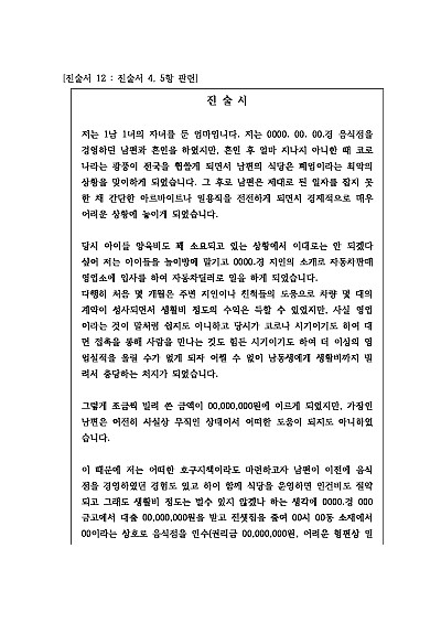 파산신청시 어떠한 경위로 파산을 신청하는지, 현재의 경제상황은 어떠한지 등은 파산여부 등을 결정하는 매우 중요한 포인트입니다. 본 진술서는 파산의 경위에 대한 내용을 담았고, 핵심은 부모님 병간호, 교통사고, 사업실패, 카드빚 등으로 결국 파산신청에 이르게 되었다는 내용입니다. 단 무단전재 방지목적으로 PDF 파일로 올리니, 혹 원본 파일이 필요하신 분들은 톡이나 문자, 메일, 전화 등을 주시면 작성방법 등에 대한 간단한 무료상담과 함께 원본 파일을 보내드리도록 하겠습니다.