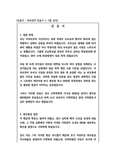 파산면책신청 시 어떠한 경위로 파산을 신청하는지, 현재의 경제상황은 어떠한지 등은 파산면책여부 등을 결정하는 매우 중요한 포인트입니다. 본 진술서는 파산의 경위에 대한 내용을 담았고, 핵심은 부모님 병간호, 교통사고, 사업실패, 카드빚 등으로 결국 파산신청에 이르게 되었다는 내용입니다. 단 무단전재 방지목적으로 PDF 파일로 올리니, 혹 원본 파일이 필요하신 분들은 톡이나 문자, 메일, 전화 등을 주시면 작성방법 등에 대한 간단한 무료상담과 함께 원본 파일을 보내드리도록 하겠습니다.