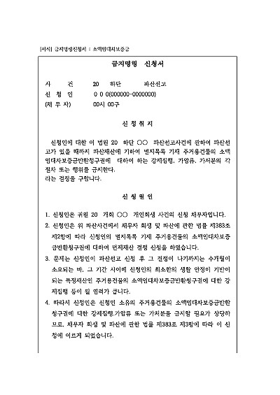 개인파산사건, 파산선고시 유체동산, 금여등에 대한 강제집행 등의 행위 금지신청시 사용되는 양식임, 단 무단전재 방지목적으로 PDF 파일로 올리니, 혹 원본 파일이 필요하신 분들은 톡이나 문자, 메일, 전화 등을 주시면 작성방법 등에 대한 간단한 무료상담과 함께 원본 파일을 보내드리도록 하겠습니다.