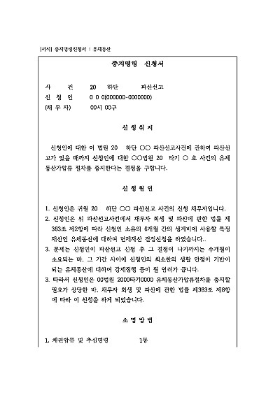 파산신청 후 선고시까지 유체동산에 대한 강제집행을 중지하기 위한 목적으로 사용되는 양식임, 단 무단전재 방지목적으로 PDF 파일로 올리니, 혹 원본 파일이 필요하신 분들은 톡이나 문자, 메일, 전화 등을 주시면 작성방법 등에 대한 간단한 무료상담과 함께 원본 파일을 보내드리도록 하겠습니다.