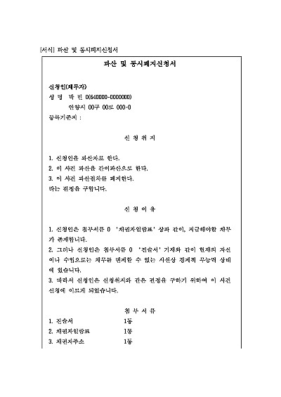 파산신청시 파산선고와 동시에 파산절차를 폐지하는 ‘동시폐지’가 원칙임. 단 무단전재 방지목적으로 PDF 파일로 올리니, 혹 원본 파일이 필요하신 분들은 톡이나 문자, 메일, 전화 등을 주시면 작성방법 등에 대한 간단한 무료상담과 함께 원본 파일을 보내드리도록 하겠습니다.