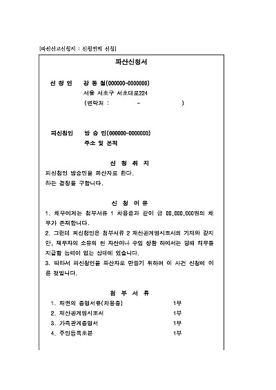 신청인이 피신청인을 파산자로 만들기 위해 사용되는 양식임, 단 무단전재 방지목적으로 PDF 파일로 올리니혹 원본 파일이 필요하신 분들은 톡이나 문자메일전화 등을 주시면 작성방법 등에 대한 간단한 무료상담과 함께 원본 파일을 보내드리도록 하겠습니다.