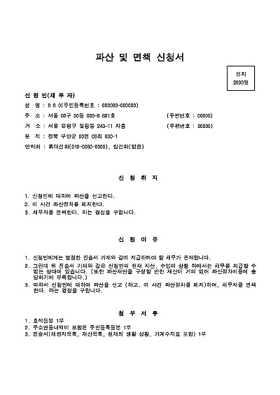 본 신청서는 실제 법원에 접수된 신청서 및 첨부서류 일체를 포함하고 있습니다. 따라서 본싸이트에서 무료로 제공되는 파산면책신청서 및 진술서 등의 양식을 다운 받은 다음 본신청서의 기재 방법을 확인하신 후 이에 따라 직접 신청서를 작성하신 후 제출하시면 됩니다. 단 무단전재 방지목적으로 PDF 파일로 올리니, 혹 원본 파일이 필요하신 분들은 톡이나 문자, 메일, 전화 등을 주시면 작성방법 등에 대한 간단한 무료상담과 함께 원본 파일을 보내드리도록 하겠습니다.