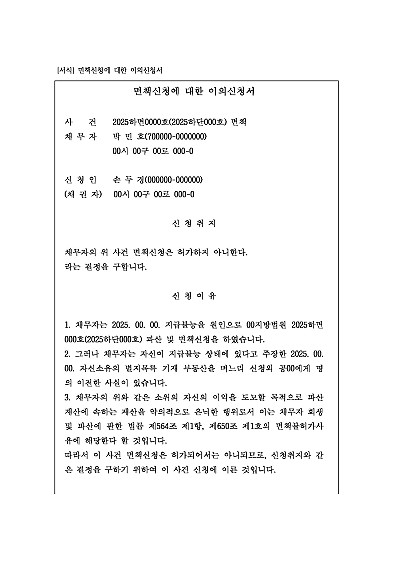 채무자의 면책신청, 면책신청 전 재산은닉 행위 확인,관련 면책신청에 대한 이의신청시 사용되는 양식임, 단 무단전재 방지목적으로 PDF 파일로 올리니, 혹 원본 파일이 필요하신 분들은 톡이나 문자, 메일, 전화 등을 주시면 작성방법 등에 대한 간단한 무료상담과 함께 원본 파일을 보내드리도록 하겠습니다.
