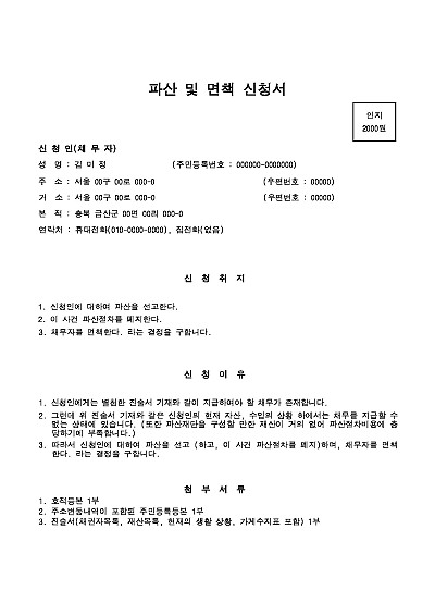 실제 법원제출 파산 및 면책신청서, 진술서, 채권자목록, 채권자주소, 재산목록, 현재의 생활상황, 가계수지표, 채무증대 등 경우 진술서 포함 요약정보 및 구매