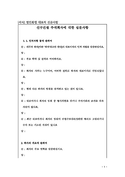 법인회생 시 대표자 신문사항 양식임.
