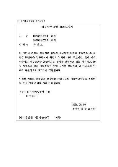 예납명령, 경제적 능력 납부능력 없다는 등의 이유로 예납명령철회신청시 사용되는 양식임, 단 무단전재 방지목적으로 PDF 파일로 올리니, 혹 원본 파일이 필요하신 분들은 톡이나 문자, 메일, 전화 등을 주시면 작성방법 등에 대한 간단한 무료상담과 함께 원본 파일을 보내드리도록 하겠습니다.
