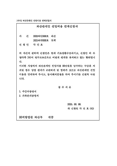 경제적인 이유로 파산관재인 선임비용 지불능력이 부족한 경우, 그 면제를 구하기 위하여 사용되는 신청서 양식임, 단 무단전재 방지목적으로 PDF 파일로 올리니, 혹 원본 파일이 필요하신 분들은 톡이나 문자, 메일, 전화 등을 주시면 작성방법 등에 대한 간단한 무료상담과 함께 원본 파일을 보내드리도록 하겠습니다.
