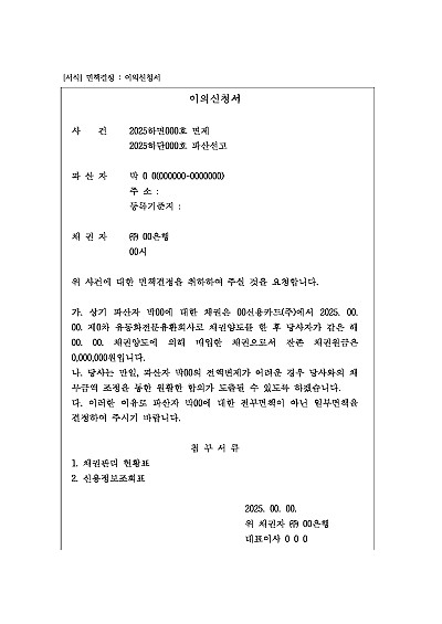 채권자가 파산신청자와 채무금액 조정을 통한 합의목적으로 면책결정 취하요청시 사용되는 신청서 양식임, 단 무단전재 방지목적으로 PDF 파일로 올리니, 혹 원본 파일이 필요하신 분들은 톡이나 문자, 메일, 전화 등을 주시면 작성방법 등에 대한 간단한 무료상담과 함께 원본 파일을 보내드리도록 하겠습니다.
