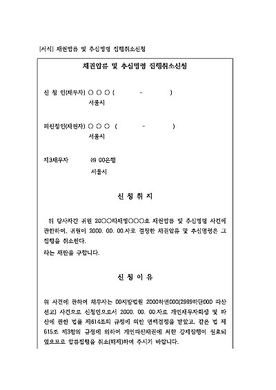 채권압류 및 추심명령 집행 후 그 취소신청시 사용하는 양식임. 단 무단전재 방지목적으로 PDF 파일로 올리니, 혹 원본 파일이 필요하신 분들은 톡이나 문자, 메일, 전화 등을 주시면 작성방법 등에 대한 간단한 무료상담과 함께 원본 파일을 보내드리도록 하겠습니다.