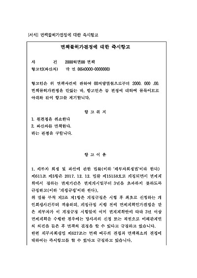 면책불허가결정에 대한 불복절차시 사용되는 양식임, 단 무단전재 방지목적으로 PDF 파일로 올리니, 혹 원본 파일이 필요하신 분들은 톡이나 문자, 메일, 전화 등을 주시면 작성방법 등에 대한 간단한 무료상담과 함께 원본 파일을 보내드리도록 하겠습니다.