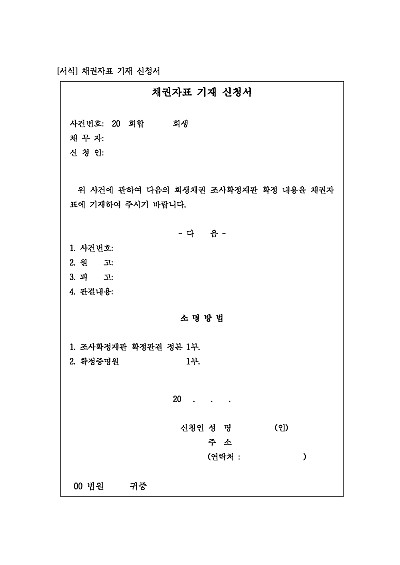회생채권 조사확정재판 확정 내용을 채권자표에 기재 요청시 사용되는 양식임, 단 무단전재 방지목적으로 PDF 파일로 올리니, 혹 원본 파일이 필요하신 분들은 톡이나 문자, 메일, 전화 등을 주시면 작성방법 등에 대한 간단한 무료상담과 함께 원본 파일을 보내드리도록 하겠습니다.