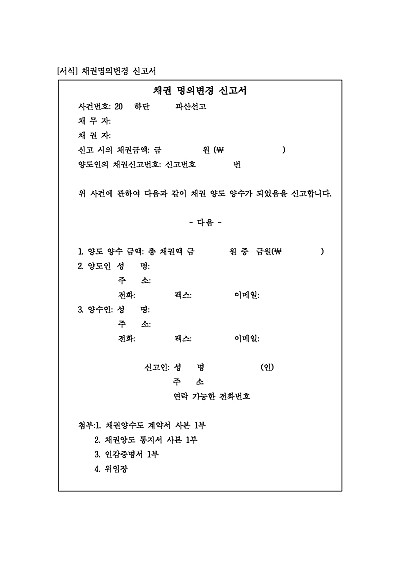 채권이 양도양수되어 이를 수령할 권리자가 변경되었을 경우 그 신고시 사용되는 양식임. 단 무단전재 방지목적으로 PDF 파일로 올리니혹 원본 파일이 필요하신 분들은 톡이나 문자메일전화 등을 주시면 작성방법 등에 대한 간단한 무료상담과 함께 원본 파일을 보내드리도록 하겠습니다.