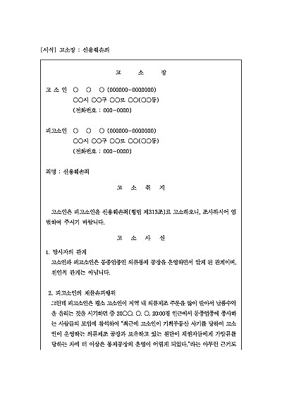 주요내용 : 고소장은 범죄 피해자나 고소권자가 수사기관에 특정 인물(피고소인)의 범죄 사실을 알리고 당해 행위에 대한 처벌을 구하는 내용을 담은 서류를 의미함단 무단전재 방지목적으로 PDF 파일로 올리니구매하신 후 혹 원본 파일이 필요하신 분들은 톡이나 문자메일전화 등을 주시면 작성방법 등에 대한 간단한 무료상담과 함께 원본 파일을 보내드리도록 하겠습니다.