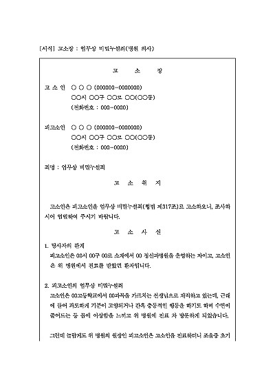 고소장 : 업무상 비밀누설죄(병원 의사) 요약정보 및 구매