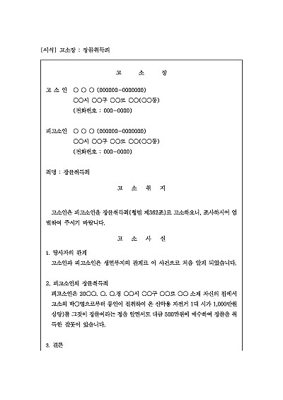 주요내용 : 고소장은 범죄 피해자나 고소권자가 수사기관에 특정 인물(피고소인)의 범죄 사실을 알리고 당해 행위에 대한 처벌을 구하는 내용을 담은 서류를 의미함단 무단전재 방지목적으로 PDF 파일로 올리니구매하신 후 혹 원본 파일이 필요하신 분들은 톡이나 문자메일전화 등을 주시면 작성방법 등에 대한 간단한 무료상담과 함께 원본 파일을 보내드리도록 하겠습니다.