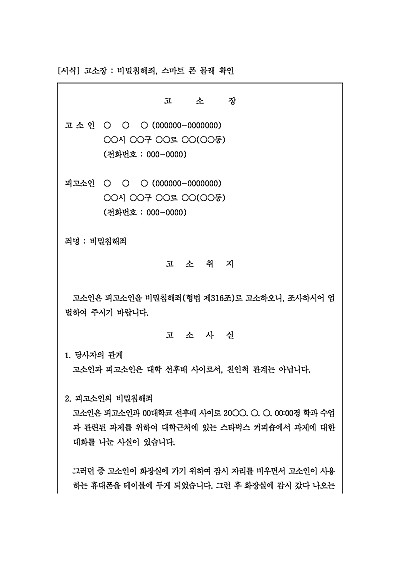 고소장 : 비밀침해죄, 스마트 폰 몰래 확인 요약정보 및 구매