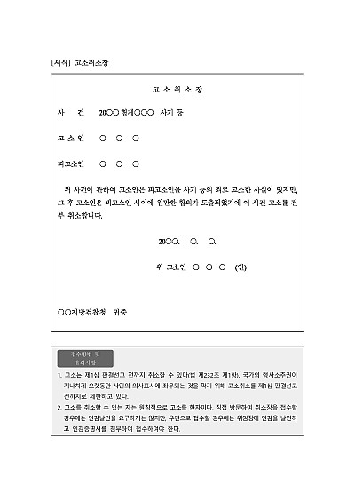 주요내용 :고소취소는 피해자가 수사기관에 제기한 고소를 취하하여 더 이상 가해자의 처벌을 원하지 않겠다는 의사를 표시하는 목적으로 사용되어지는 양식임(참고로 고소는 제1심 판결 선고 전까지 취소할 수 있으며, 취소하면 동일 사건에 대해 다시 고소할 수 없음)단 무단전재 방지목적으로 PDF 파일로 올리니구매하신 후 혹 원본 파일이 필요하신 분들은 톡이나 문자메일전화 등을 주시면 작성방법 등에 대한 간단한 무료상담과 함께 원본 파일을 보내드리도록 하겠습니다.