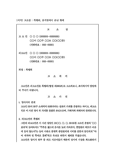 고소장 : 폭행죄, 음식점에서 손님 행패 요약정보 및 구매