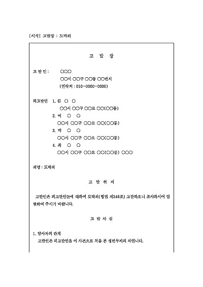 주요내용 : 고발장은 범죄 피해자가 아닌 제3자가 수사기관에 범죄사실을 신고하여 당해 행위에 대한 처벌을 구하는 내용을 담은 서류를 의미함단 무단전재 방지목적으로 PDF 파일로 올리니구매하신 후 혹 원본 파일이 필요하신 분들은 톡이나 문자메일전화 등을 주시면 작성방법 등에 대한 간단한 무료상담과 함께 원본 파일을 보내드리도록 하겠습니다.