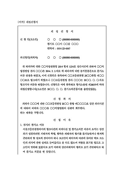 주요내용 : 검사의 불기소처분에 대하여 고소인 등이 그 결정이 부당하다는이유로 법원에 공소제기 여부에 대한 재정을 신청하기 위한 목적으로 사용되어지는 신청서 양식임. 단 무단전재 방지목적으로 PDF 파일로 올리니, 구매하신 후 혹 원본 파일이 필요하신 분들은 톡이나 문자, 메일, 전화 등을 주시면 작성방법 등에 대한 간단한 무료상담과 함께 원본 파일을 보내드리도록 하겠습니다.