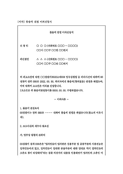 주요내용 : 경찰의 사건 수사 후 불송치결정에 대한 불복절차로 활용되어지는 양식임, 이의신청이 접수되면 사건은 경찰의 판단과 무관하게 검찰로 송치되며, 검사가 사건을 검토하게 됨. 단 무단전재 방지목적으로 PDF 파일로 올리니구매하신 후 혹 원본 파일이 필요하신 분들은 톡이나 문자메일전화 등을 주시면 작성방법 등에 대한 간단한 무료상담과 함께 원본 파일을 보내드리도록 하겠습니다
