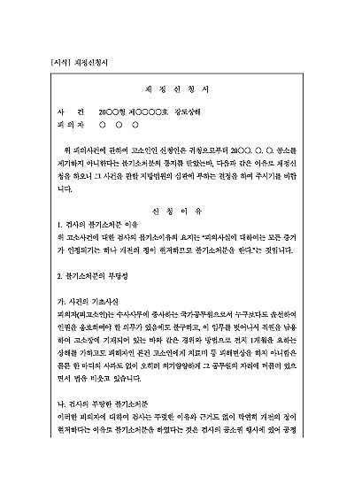 주요내용 : 검사의 불기소처분에 대하여 고소인 등이 그 결정이 부당하다는이유로 법원에 공소제기 여부에 대한 재정을 신청하기 위한 목적으로 사용되어지는 신청서 양식임. 단 무단전재 방지목적으로 PDF 파일로 올리니, 구매하신 후 혹 원본 파일이 필요하신 분들은 톡이나 문자, 메일, 전화 등을 주시면 작성방법 등에 대한 간단한 무료상담과 함께 원본 파일을 보내드리도록 하겠습니다.