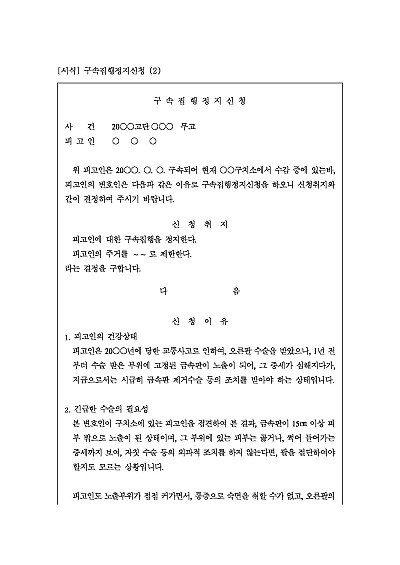 주요내용 : 구속된 피고인에 대해 중병, 출산, 가족의 장례참석 등 상당한 이유가 있다고 판단될 경우 구속의 효력을 일시적으로 정시시켜 피고인을 석방하게 할 목적으로 사용되어지는 신청서 양식임. 단 무단전재 방지목적으로 PDF 파일로 올리니, 구매하신 후 혹 원본 파일이 필요하신 분들은 톡이나 문자, 메일, 전화 등을 주시면 작성방법 등에 대한 간단한 무료상담과 함께 원본 파일을 보내드리도록 하겠습니다.
