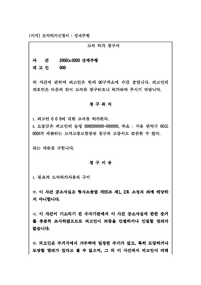 주요내용 : 구속된 피고인이 법원에 일정한 보증금을 납부하는 조건으로 보석허가를 요청하여 석방된 상태에서 재판을 받을 수 있도록 하기 위한 목적으로 사용되어지는 신청서 양식임. 단 무단전재 방지목적으로 PDF 파일로 올리니, 구매하신 후 혹 원본 파일이 필요하신 분들은 톡이나 문자, 메일, 전화 등을 주시면 작성방법 등에 대한 간단한 무료상담과 함께 원본 파일을 보내드리도록 하겠습니다.
