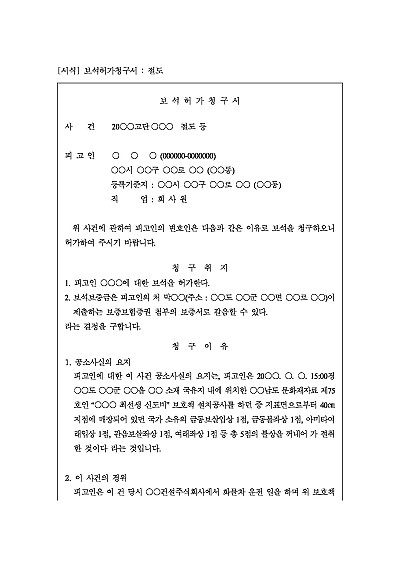 주요내용 : 구속된 피고인이 법원에 일정한 보증금을 납부하는 조건으로 보석허가를 요청하여 석방된 상태에서 재판을 받을 수 있도록 하기 위한 목적으로 사용되어지는 신청서 양식임. 단 무단전재 방지목적으로 PDF 파일로 올리니구매하신 후 혹 원본 파일이 필요하신 분들은 톡이나 문자메일전화 등을 주시면 작성방법 등에 대한 간단한 무료상담과 함께 원본 파일을 보내드리도록 하겠습니다