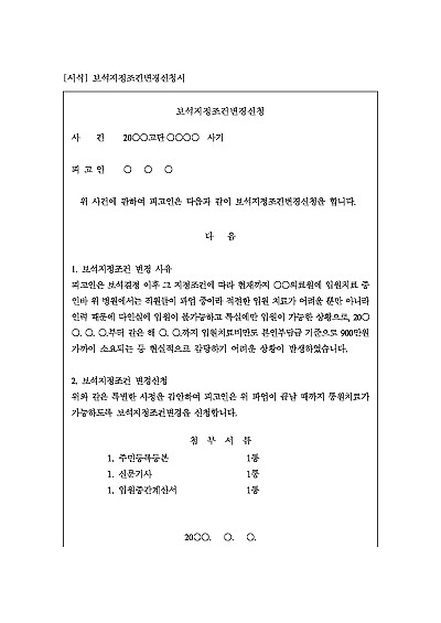 주요내용 : 구속된 피고인이 보석허가를 받은 후 보석허가 당시와 달라진 사정으로 인하여 기존의 보석조건을 지키기 어려워졌을 때 법원에 그 변경을 구하기 위한 목적으로 사용되어지는 신청서 양식임. 단 무단전재 방지목적으로 PDF 파일로 올리니, 구매하신 후 혹 원본 파일이 필요하신 분들은 톡이나 문자, 메일, 전화 등을 주시면 작성방법 등에 대한 간단한 무료상담과 함께 원본 파일을 보내드리도록 하겠습니다.