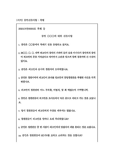 주요내용 : 법원이 법죄 사실을 입증하기 위하여 사건과 관련된 피해자, 목격자 등 증인을 법정에 소환하여 증인에게 직접 사살관계를 묻고 진술을 듣기 위한 목적으로 사용되어지는 신문사항 양식임. 단 무단전재 방지목적으로 PDF 파일로 올리니, 구매하신 후 혹 원본 파일이 필요하신 분들은 톡이나 문자, 메일, 전화 등을 주시면 작성방법 등에 대한 간단한 무료상담과 함께 원본 파일을 보내드리도록 하겠습니다.