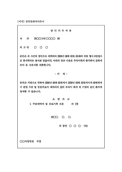 주요내용 : 법원에서 증인으로 출석하라는 통보를 받았지만 정당한 이유로 출석을 할 수 없을 때 그 사유 및 관련 증거를 첨부하여 법원에 제출할 때 사용되어지는 양식임. 단 무단전재 방지목적으로 PDF 파일로 올리니, 구매하신 후 혹 원본 파일이 필요하신 분들은 톡이나 문자, 메일, 전화 등을 주시면 작성방법 등에 대한 간단한 무료상담과 함께 원본 파일을 보내드리도록 하겠습니다.