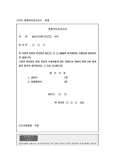 주요내용 : 피고인이 공판기일 소환 통보를 받았지만 정당한 이유로 출석을 할 수 없을 때 그 사유 및 관련 증거를 첨부하여 법원에 제출할 때 사용되어지는 양식임. 단 무단전재 방지목적으로 PDF 파일로 올리니, 구매하신 후 혹 원본 파일이 필요하신 분들은 톡이나 문자, 메일, 전화 등을 주시면 작성방법 등에 대한 간단한 무료상담과 함께 원본 파일을 보내드리도록 하겠습니다.