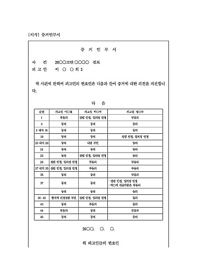 주요내용 : 피고사건에 관하여 검사가 제출한 증거에 대해 피고인이나 변호인이 각 증거에 대한 인정여부 등을 밝히기 위하여 사용되어지는 신청서 양식임. 단 무단전재 방지목적으로 PDF 파일로 올리니구매하신 후 혹 원본 파일이 필요하신 분들은 톡이나 문자메일전화 등을 주시면 작성방법 등에 대한 간단한 무료상담과 함께 원본 파일을 보내드리도록 하겠습니다.