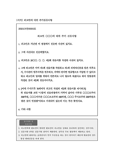 주요내용 : 주신문에서 나온 증언의 신빙성을 탄핵하고 피고인에게 유리한 사실을 이끌어 내기 위한 목적으로 사용되어지는 양식임. 단 무단전재 방지목적으로 PDF 파일로 올리니구매하신 후 혹 원본 파일이 필요하신 분들은 톡이나 문자메일전화 등을 주시면 작성방법 등에 대한 간단한 무료상담과 함께 원본 파일을 보내드리도록 하겠습니다.