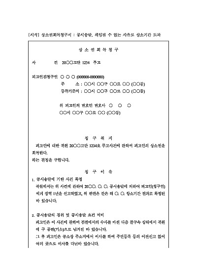 주요내용 : 자신의 책임없는 사유로 인해 법정 기간 내에 상소를 하지 못했을 때 그 상소권을 회복해 달라고 법원에 청구할 때 사용되어지는 청구서 양식임. 단 무단전재 방지목적으로 PDF 파일로 올리니, 구매하신 후 혹 원본 파일이 필요하신 분들은 톡이나 문자, 메일, 전화 등을 주시면 작성방법 등에 대한 간단한 무료상담과 함께 원본 파일을 보내드리도록 하겠습니다.