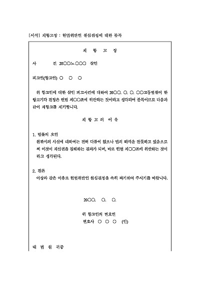 주요내용 : 원심결정의 법률 등 위반, 사실오인, 양형부당 등의 사유로 불복하여 대법원의 판단을 다시 한번 받기 위해 사용되어지는 항고장. 단 무단전재 방지목적으로 PDF 파일로 올리니, 구매하신 후 혹 원본 파일이 필요하신 분들은 톡이나 문자, 메일, 전화 등을 주시면 작성방법 등에 대한 간단한 무료상담과 함께 원본 파일을 보내드리도록 하겠습니다.