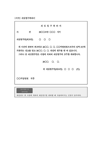 주요내용 : 확정된 유죄판결을 오류를 바로잡기 위해 재심을 제기한 후 사정에 의하여 이를 취하할 때 사용되어지는 양식임. 단 무단전재 방지목적으로 PDF 파일로 올리니, 구매하신 후 혹 원본 파일이 필요하신 분들은 톡이나 문자, 메일, 전화 등을 주시면 작성방법 등에 대한 간단한 무료상담과 함께 원본 파일을 보내드리도록 하겠습니다.