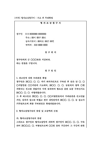 주요내용 : 억울하게 형사처벌을 받은 사람이 그로 인해 입은 손해를 국가에 보상에 달라고 청구하기 위한 목적으로 사용되어지는 청구서 양식임. 단 무단전재 방지목적으로 PDF 파일로 올리니, 구매하신 후 혹 원본 파일이 필요하신 분들은 톡이나 문자, 메일, 전화 등을 주시면 작성방법 등에 대한 간단한 무료상담과 함께 원본 파일을 보내드리도록 하겠습니다.