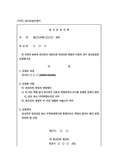 주요내용 : 피고인이 범행 당시 심신상실 또는 심신미약 상태에 있었는지, 그 정도가 어느 정도인지 등을 법관의 판단을 돕기 위한 목적으로 사용되어지는 신청서 양식임. 단 무단전재 방지목적으로 PDF 파일로 올리니, 구매하신 후 혹 원본 파일이 필요하신 분들은 톡이나 문자, 메일, 전화 등을 주시면 작성방법 등에 대한 간단한 무료상담과 함께 원본 파일을 보내드리도록 하겠습니다.
