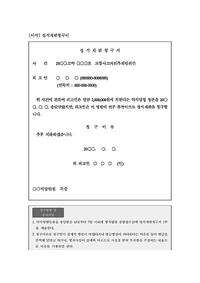 주요내용 : 약식명령에 불복하여 통상적인 재판절차에 따라 다시 재판에 달라고 법원에 청구할 때 사용되어지는 청구서 양식임. 단 무단전재 방지목적으로 PDF 파일로 올리니, 구매하신 후 혹 원본 파일이 필요하신 분들은 톡이나 문자, 메일, 전화 등을 주시면 작성방법 등에 대한 간단한 무료상담과 함께 원본 파일을 보내드리도록 하겠습니다.