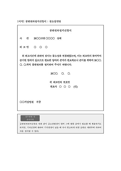 주요내용 : 공소장 변경 등 일정한 사정이 있을 때 변론준비 등을 위해 법원에 공판절차를 일시 중단해 달라고 요청할 때 사용되어지는 신청서 양식임. 단 무단전재 방지목적으로 PDF 파일로 올리니, 구매하신 후 혹 원본 파일이 필요하신 분들은 톡이나 문자, 메일, 전화 등을 주시면 작성방법 등에 대한 간단한 무료상담과 함께 원본 파일을 보내드리도록 하겠습니다.