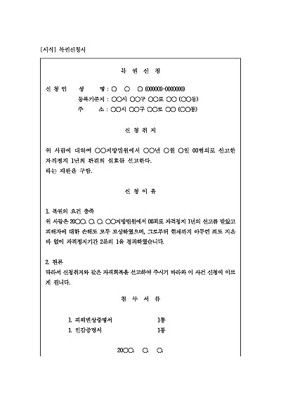 주요내용 : 자격정지 이상의 형을 선고받은 사람이 피해자의 손해를 배상하고, 자격정지 이상의 형을 받지 않은 채 정지 기간의 2분의 1이 경과했을 때, 법원의 자격 회복을 선고를 구하기 위한 목적으로 사용되어지는 신청서 양식임. 단 무단전재 방지목적으로 PDF 파일로 올리니, 구매하신 후 혹 원본 파일이 필요하신 분들은 톡이나 문자, 메일, 전화 등을 주시면 작성방법 등에 대한 간단한 무료상담과 함께 원본 파일을 보내드리도록 하겠습니다.