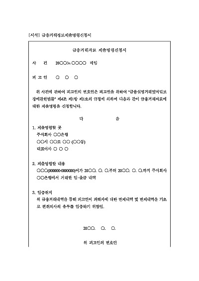 주요내용 : 형사 공판절차에서 자시의 주장사실을 입증하기 위한 목적으로 상대방 또는 제3자의 금융거래 정보를 확보하기 위한 목적으로 사용되어지는 신청서 양식임. 단 무단전재 방지목적으로 PDF 파일로 올리니, 구매하신 후 혹 원본 파일이 필요하신 분들은 톡이나 문자, 메일, 전화 등을 주시면 작성방법 등에 대한 간단한 무료상담과 함께 원본 파일을 보내드리도록 하겠습니다.