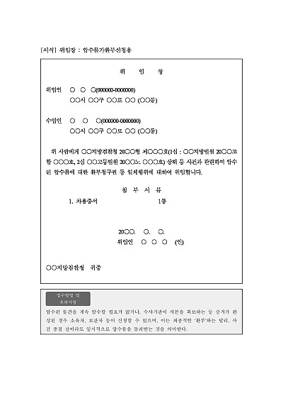 주요내용 : 압류물에 대한 가환부신청시 그 행위를 대리인에게 위임하기 위한 목적으로 사용되어지는 위임장 양식임. 단 무단전재 방지목적으로 PDF 파일로 올리니, 구매하신 후 혹 원본 파일이 필요하신 분들은 톡이나 문자, 메일, 전화 등을 주시면 작성방법 등에 대한 간단한 무료상담과 함께 원본 파일을 보내드리도록 하겠습니다.
