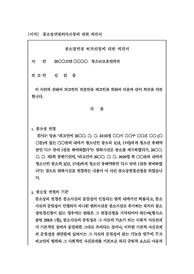 주요내용 : 피고인이 검사의 공소장변경허가신청에 대한 자신의 의견을 개진하기 위한 목적으로 사용되어지는 양식임. 단 무단전재 방지목적으로 PDF 파일로 올리니, 구매하신 후 혹 원본 파일이 필요하신 분들은 톡이나 문자, 메일, 전화 등을 주시면 작성방법 등에 대한 간단한 무료상담과 함께 원본 파일을 보내드리도록 하겠습니다.